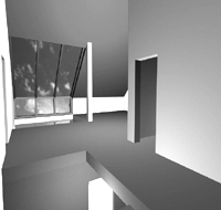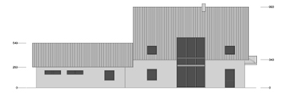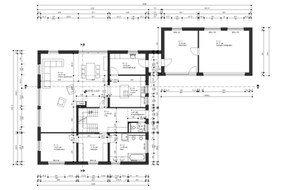 Der daneben errichtete Baukörper beherbergt eine kleine Werkstatt, die der Bauherr selbst nutzt und eine Doppelgarage. Dieser Bereich ist durch einen geschlossenen Flur mit dem Wohnhaus verbunden, der einen witterungsunabhängigen Zugang zum Wohnhaus herstellt. Da das Wohnhaus in einem dünn besiedelten Landschaftsraum liegt konnte damit gleichzeitig dem erhöhten Sicherheitsbedürfnis Rechnung getragen werden.