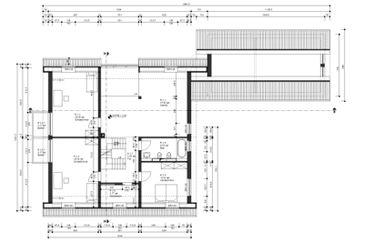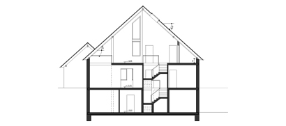Im Erdgeschoss ist prinzipiell in zwei Bereiche unterteilt, einer öffentlichen Zone mit Wohnküche und Wohnzimmer, das durch einen grosszügigen Deckenausschnitt auch eine Beziehung mit dem Dachgeschoss herstellt. Die zweite sehr private Zone setzt sich aus dem Schlafzimmer der Hauseigentümer, einem Ankleidezimmer und einem grosszügigen Bedezimmer zusammen. Der Zugang zu diesem Bereich erfolgt über das Ankleidezimmer, das gleichzeitig als Verteiler zu den beiden anderen Räumen dient.