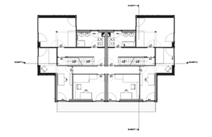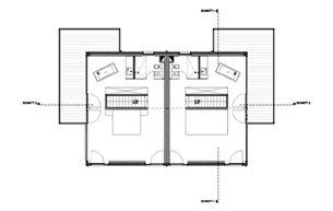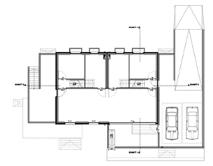 Im Kellergeschoss sind die beiden Doppelhaushälfen durch einen gemeinsamen Spiel- und Hobbyraum verbunden, im 1. Obergeschoss gibt es einen verbindenden Flur. Ansonsten sind die Häuser vollständig voneinander getrennt.