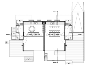 Die beiden Häuser verschmelzen durch die geschaffenen Verbindungen scheinbar zu einem Einfamilienhaus, die konsequente Trennung im Erd- und Dachgeschoss macht allerdings deutlich, daß es Wille der Bauherren war zwei getrennte Häuser zu erhalten. Ein Teil der Bewohnerschaft erhält durch diese Konzeption priviligierte Zugangsrechte zu beiden Häusern anderen bleibt der Zugang verwehrt.