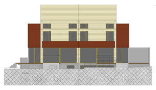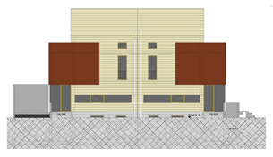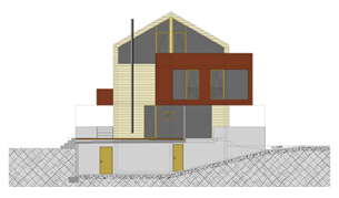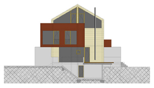 Das Doppelhaus in Kleinmachnow ist in Massivbauweise mit Vollwärmeschutz geplant. Als Wetterschale wurde ein Lärchenschirm aus horizontal verlaufenden Latten gewählt. Die im ersten Obergeschoss zu zwei Seiten auskragenden Räume erhalten Seitenwände aus vorgefertigten Holztafelelementen, die mit Cor-Ten-Stahl verkleidet werden.